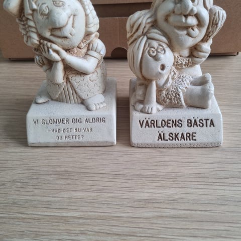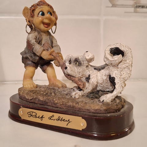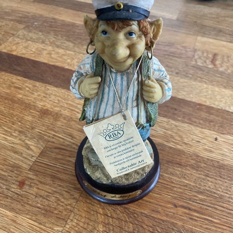 Rolf Lidberg RBA figur föreställande två troll i båt. Skulpturen står på en oval fot med RBA-märkning undertill och namnskylt framtill. Flerfärgad figur med detaljerade kläder och ansiktsuttryck. Passar som prydnad eller samlarföremål för den som uppskattar Rolf Lidbergs trollemotiv. Begränsad och numrerad upplaga.