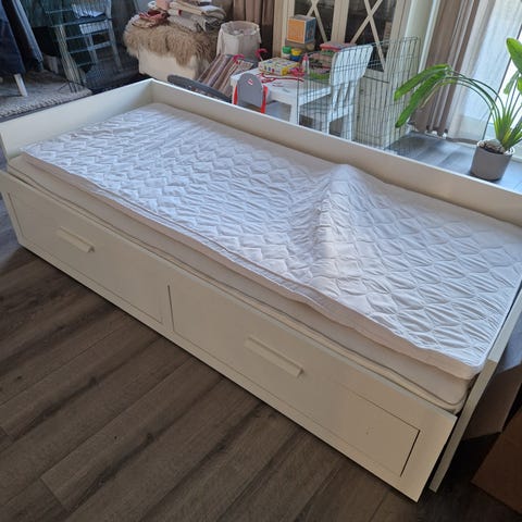 Madrasserna är synligt använda och behöver ett madrassöverdrag.