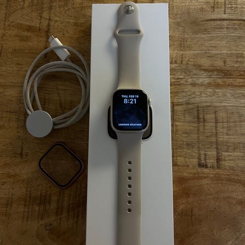 Apple Watch Series 5 smartklocka 40mm i roséguldfärgat aluminiumhölje. Pekskärm i färg och digital krona på sidan. Klockan levereras med flera utbytbara sportarmband i lila och rosa samt laddkabel.