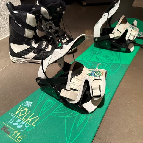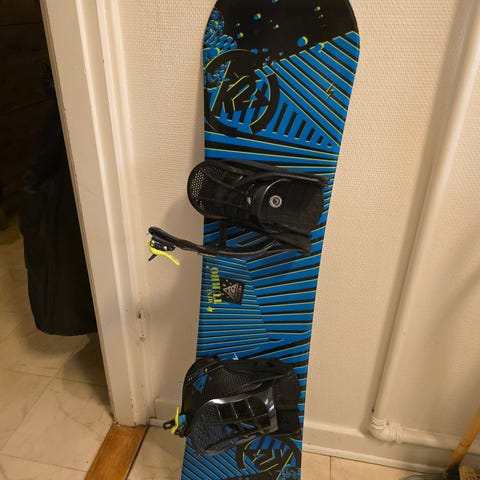 Burnt snowboard med bindningar. Brädan har en tvåfärgad ovansida i rött och beige med grafiskt motiv och vit undersida med Burnt-logotyp. Bindningarna är monterade och har vita basplattor med svarta och vita remmar. Passar för allmän snowboardåkning i pist eller park.