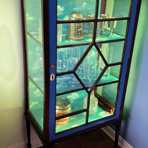 IKEA vitrinskåp i gult med glasdörrar och glasade sidor. Skåpet har flera glashyllor som ger god överblick och plats för förvaring eller exponering av föremål som porslin, glas eller samlarobjekt.