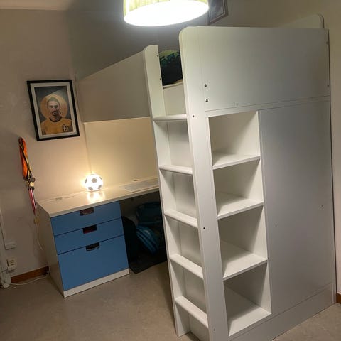 IKEA Småstad loftsäng med skrivbord och förvaring i vit färg, mått 90x200 cm. Loftsängen har integrerat skrivbord med tre lådor samt hyllor och garderobsdel med trådbackar för förvaring. Stege på sidan ger tillgång till sängen upptill. Passar som platsbesparande lösning i barn- eller ungdomsrum med kombinerad sov-, studie- och förvaringsyta.