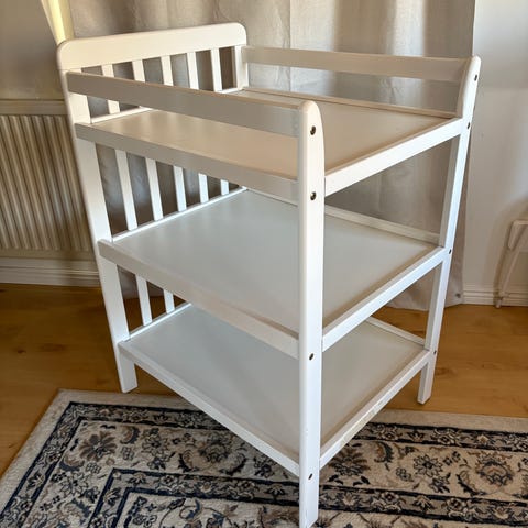 Skötbord från IKEA, modellen Gulliver med två öppna hyllplan. Överdel med skötyta och skyddande kanter. Två hyllor under skötytan ger plats för förvaring av blöjor, kläder och andra tillbehör.
