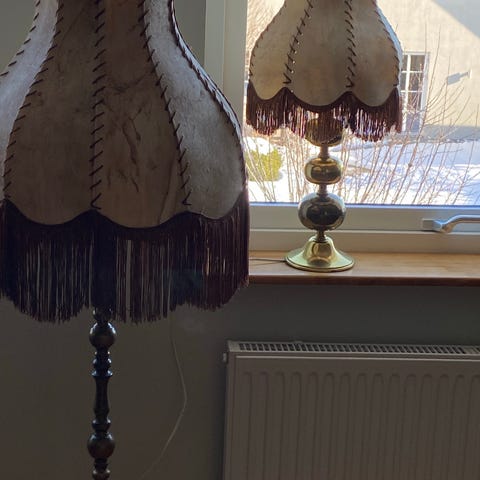 Fin golvlampa i mörkt trä och delar av mässing. Finns liknande på auktioner och beskrivs då som 1970-tal. Köpt precis vintage men passade inte i inredningen hemma. Värderad till 600kr. Fungerar bra, har modern glödlampa och gräddvit skärm i fint skick. Finns lampknapp både vid skärm och i golvsladden.
