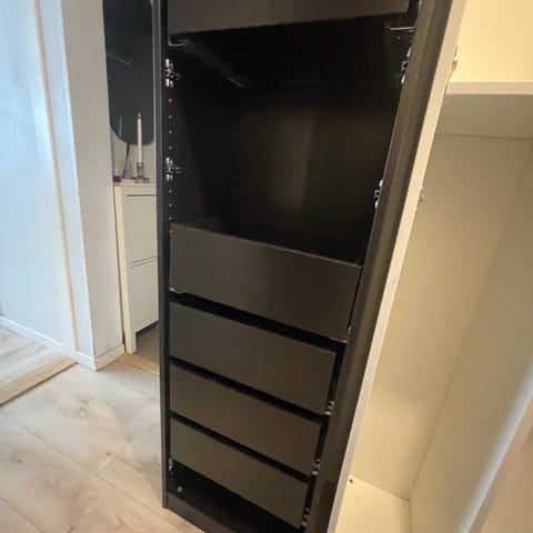 Garderoben finns på Södermalm och är isärskruvad (just nu till tre stommar utan inredning) för att kunna tas ut ur lägenheten. Alla skruvar etc medföljer, allt i bra men använt skick. Hämtas på Södermalm i Stockholm.
