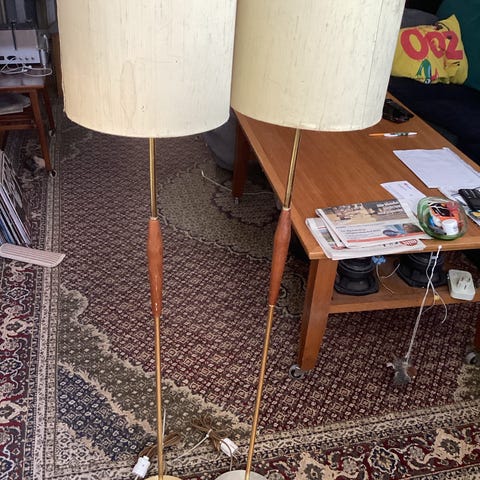 Ovanlig Retro golvlampa med inbyggt bord. Sarg o fot i mässing/ svart. 50-talet. Patina.