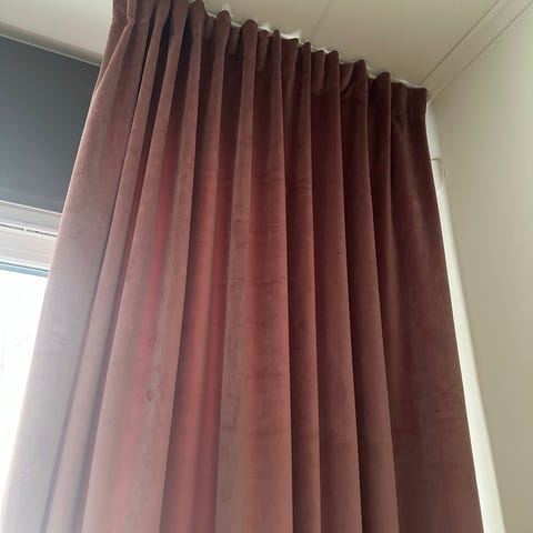 Mio gardinpar i sammetsliknande tyg i brun färg. Gardinerna är 250 cm långa. Skötselråd enligt bild: skontvätt 30 °C, hängtorkas, tvättas med liknande färger och tål torktumling. Passar för användning i vardagsrum, sovrum eller andra rum där mörkläggande och dekorativ textil önskas.