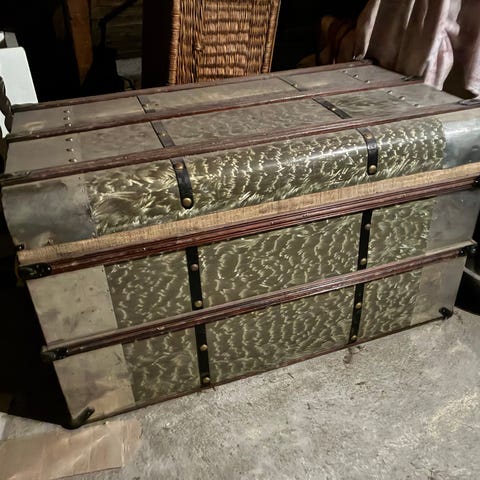 Äldre reskista/ångkista med grön dukklädd utsida, träslåar och metallbeslag. Märkt PUB Stockholm. Troligen 1920–40-tal.
