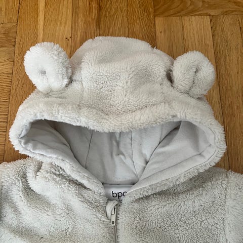 H&M babyjacka med huva i storlek 68 för unisex. Jackan är beige och tillverkad i bomull. Modellen har dragkedja framtill och huva med djurdetaljer. Passar som ytterplagg för spädbarn vid svalare väder.