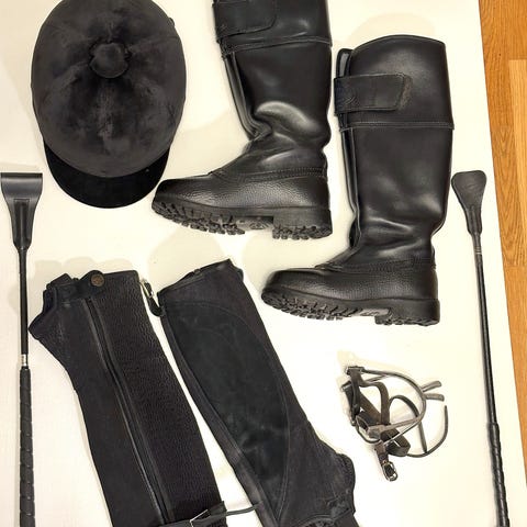 Ryttarutrustning set ridstövlar ridskor ridhjälm ridspö strumpor svart