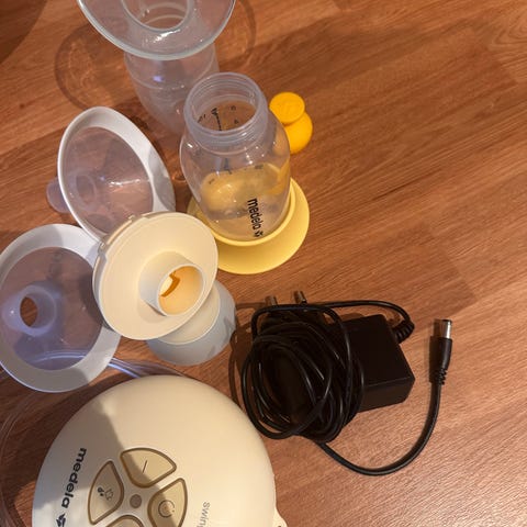 Medela Swing bröstpump med flera tillhörande delar. Elpump med kontrollenhet, slang och trattar samt flera nappflaskor med volymmarkering. Flera lock, ventiler och adaptrar ingår enligt bilderna. Utrustningen är avsedd för bröstpumpning och uppsamling av bröstmjölk i flaskor för förvaring och matning av spädbarn.