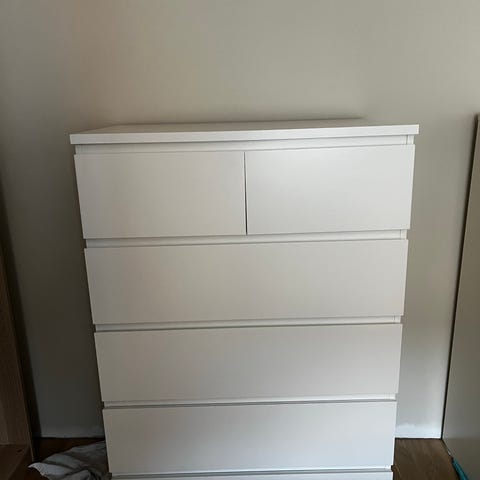 IKEA malm byrå i vit färg med sex lådor. Byrån har två mindre lådor överst och fyra större lådor under.