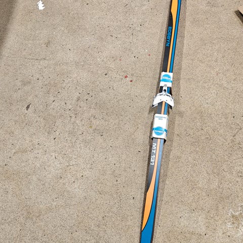 Fina längdskidor i nyskick (endast använda vid ett tillfälle) inkluderar även stavar. Skidorna är vallningsfria med fjäll på baksidan.