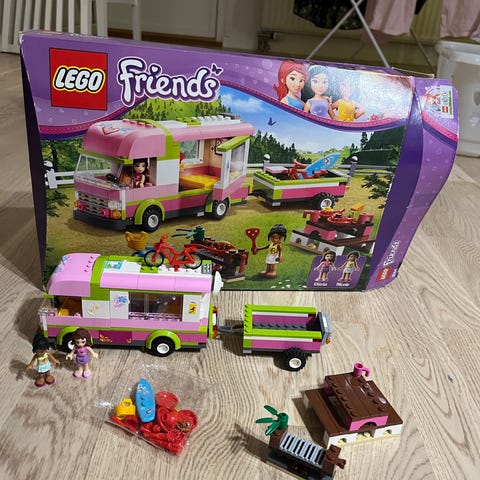 LEGO Friends lekset med husbil, tält och häst. Setet innehåller en färgglad husbil med takräcke och tillbehör, fristående tält, träd och mindre byggdelar. I setet ingår även minifigurer samt djurfigur, tillsammans med flera små tillbehör som kan användas för att skapa olika camping- och friluftsscener. Passar för barn som gillar LEGO Friends-temat och lek med fordon, natur och djur.