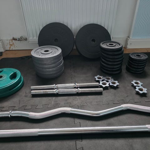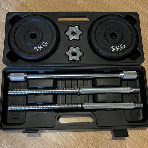 Dumbbell set hantelset med lösa viktskivor i väska. Setet innehåller två hantelstänger med gängade ändar, flera runda viktskivor samt skruvlås för att säkra vikterna. Förvaringsväskan är i hårdplast och håller stänger, vikter och lås på plats. Passar för styrketräning hemma, till exempel bicepscurl, axelpress och andra övningar där fria vikter används.