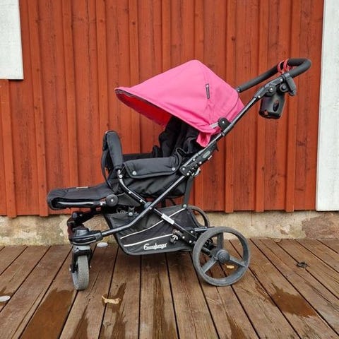 * Enkel att fälla ihop, går att reglera höjden & tilta sitt/liggdelen i chassit