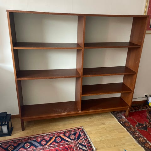 Fin liten bokhylla i mörkt trä. Fyra hyllplan. En hel del skav och märken, främst ovanpå (se bild). Annars stabil och i bra skick.