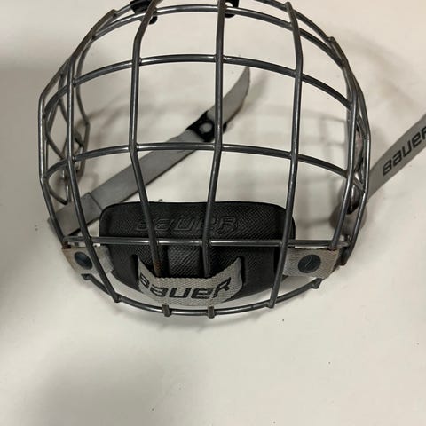 Bauer hockeyhjälmar med galler. En röd och en mörkblå. Hjälmarna är utrustade med heltäckande metallgaller framtill för ansiktsskydd. Justerbar passform. Avsedd för ishockey eller liknande isidrott där huvud- och ansiktsskydd krävs.