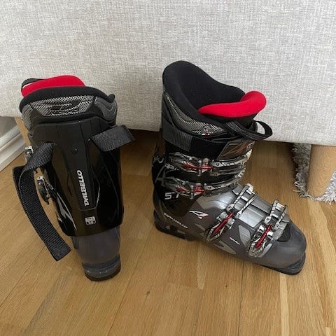 Skidpjäxor i storlek 27,5 (innersula ca 27,5 cm) med yttermått 316 mm. Pjäxorna är svarta med vita och metallfärgade detaljer och har flera justerbara spännen framtill för att kunna anpassa passformen. Lämpliga för alpin skidåkning.