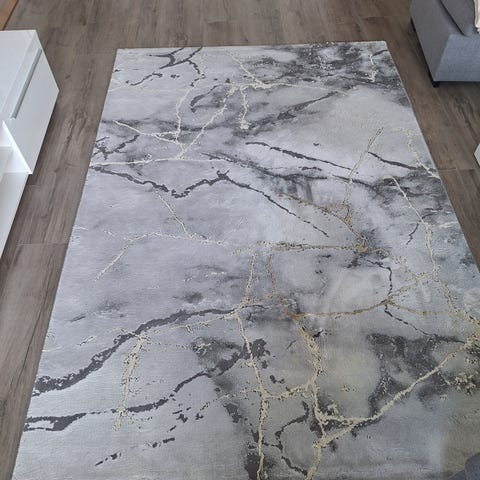IKEA matta i rektangulär form med mörkgrå botten och vitt geometriskt mönster. Passar exempelvis i hall, sovrum eller vardagsrum. Mattan ligger platt mot golvet och täcker en större del av rummet, lämplig för normal hemmamiljö.
