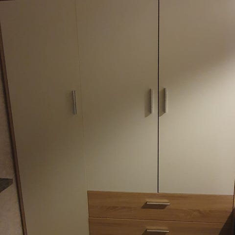 Garderobssystem från Ikea anpassat för rum med snedtak eller under trapp. Fint skick men finns tecken på användning. Funktionen är det inget fel på.