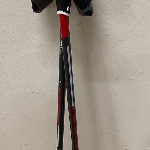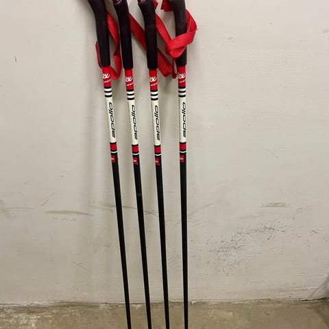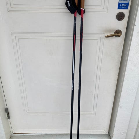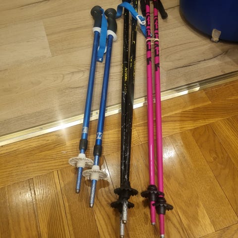 Skidstavar för barn i två par, ett svart och ett blått. Båda paren har handtag med remmar. 70 och 80 cm.