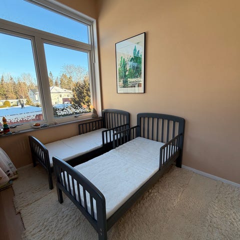 Några små avskavda märken finns på ramen, går nog att snygga till om det upplevs störande. Mått finns på sista bilden. 3-delad madrass och diverse tillbehör kan ingå om så önskas (kudde, täcke, påslakanset). Finns på Lidingö, Rudboda.