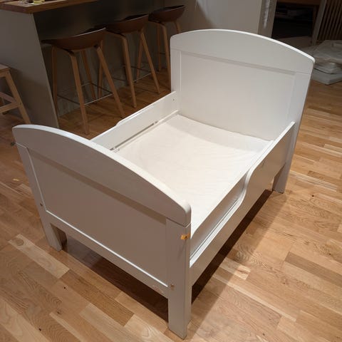 Troll junior/växasäng i vitlackerat trä. Lämplig som övergångssäng mellan spjälsäng och fullstor säng.