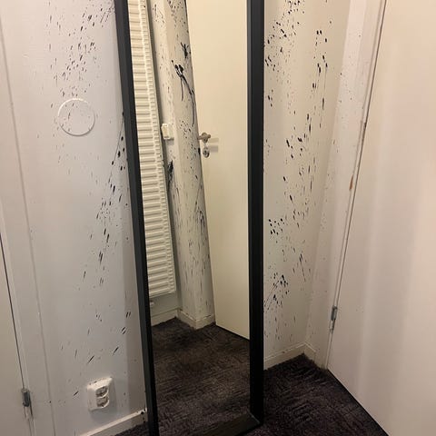 IKEA spegel med svart ram. Rektangulär helkroppsspegel. Passar exempelvis i hall, sovrum eller vardagsrum för helkroppsreflektion och som inredningsdetalj.