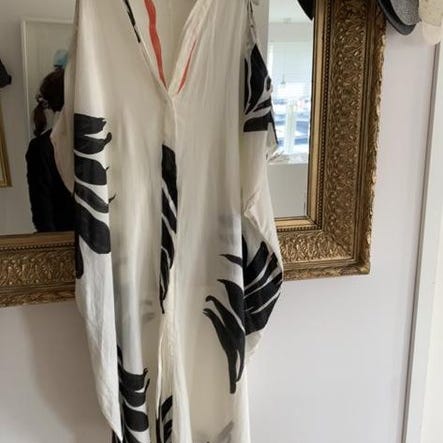Klänning med ett grafiskt mönster i svart och vitt. Klänningen har en V-ringning och korta ärmar. Passar bra för en avslappnad stil. Storlek L. Fint skick men några svarta prickar framtill, väldigt små, se sista bild