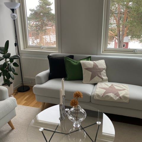 Mycket fint skick. Den mönstrade kudden är från Boel & Jan och den enfärgade minns jag ej märket på.