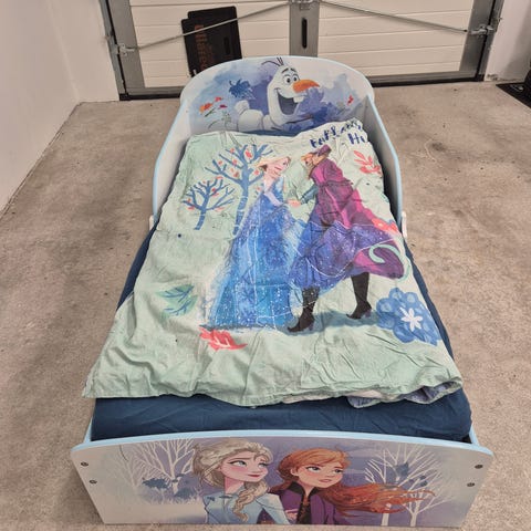 Barnsäng i trä med grön lackerad ram. Sängen har ribbotten i trä och höga gavlar som ger ombonad känsla. Passar som övergångssäng mellan spjälsäng och fullstor säng för barn. Dekorativ figur på huvudgaveln. 115x60cm