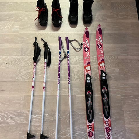 Nordic längdskidor för barn med stavar i blå och vit färg. Skidorna har rembindningar som passar vanliga vinterkängor eller stövlar. Undersidan har mönstrad beläggning för bättre fäste i snö. Medföljande stavar har plasttrugor och handtag med rem. Lämpligt set för barn som vill åka längdskidor.