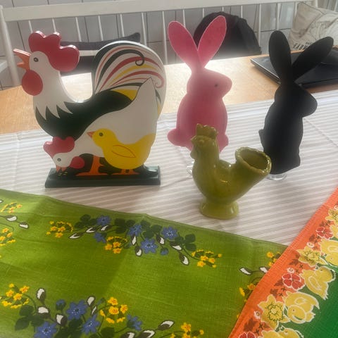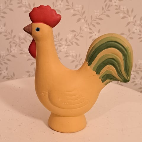 Jättefint pynt i horn av en tupp, käka och kyckling i trä. Skulle tro 70-tal. Retro!