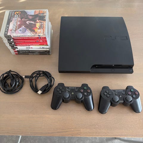 Sony Playstation 3 spelkonsol i svart utförande. Konsolen är av den slimmade modellen och ansluts till TV via HDMI eller annan kompatibel videoutgång. På bilderna syns även trådbundna handkontroller. Konsolen kan användas för Playstation 3-spel, filmuppspelning via Blu-ray/DVD samt olika mediafunktioner beroende på anslutningar och inställningar. Eventuella tillbehör som kablar och kontroller framgår av bilderna om de ingår i paketet.