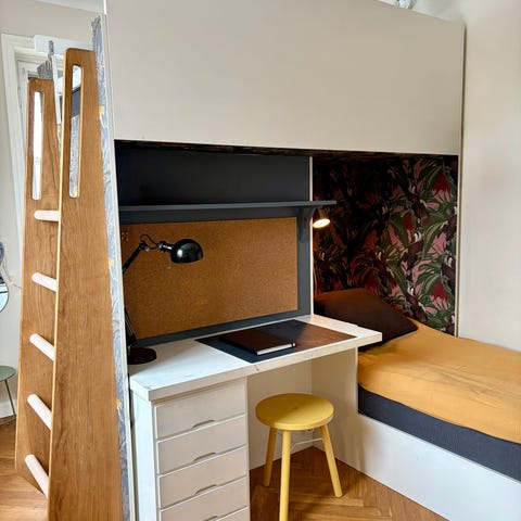 IKEA loftsäng i trä med integrerat skrivbord och förvaringsdel. Sängen är upphöjd med stege på sidan och har sängplats upptill. Under sängen finns arbetsyta med bordsskiva samt förvaring i form av garderob och öppna hyllor. Konstruktionen är huvudsakligen i trä med vita och rosa skivor på skrivbord och förvaringsdel. Passar som kombinerad sov- och arbetsplats i barn- eller ungdomsrum.