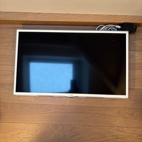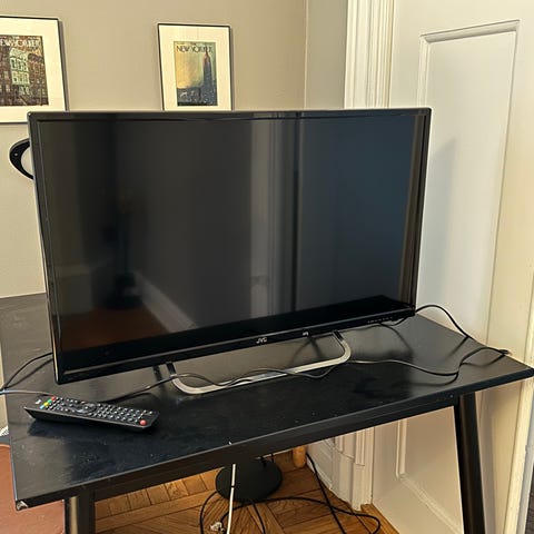 Platt tv från Samsung 28”, äldre modell men har använts väldigt sparsamt, finns inga tecken på slitage. Foten sitter lite löst (finns uttag för två skruvar till) men kan stå upp oavsett. Fjärrkontroll medföljer inte, finns dock en joystick på baksidan som man kan navigera med.