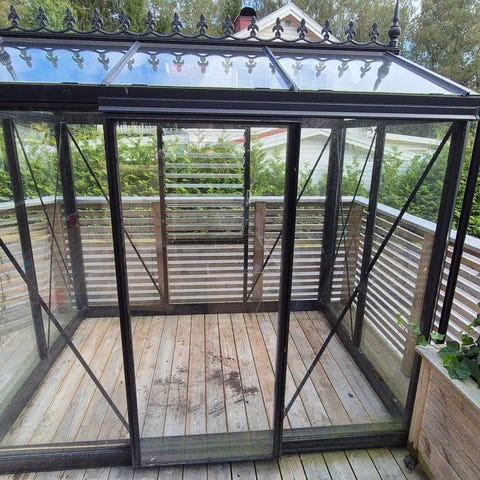 Växthusformat lykthus i metall och glas. Överdelen i glas går att lyfta av från underdelen för enkel placering av ljus eller dekorationer. Metallstomme med glasväggar och glas i taket, utformad som ett litet växthus. Passar för blockljus eller som dekorationshus inomhus.