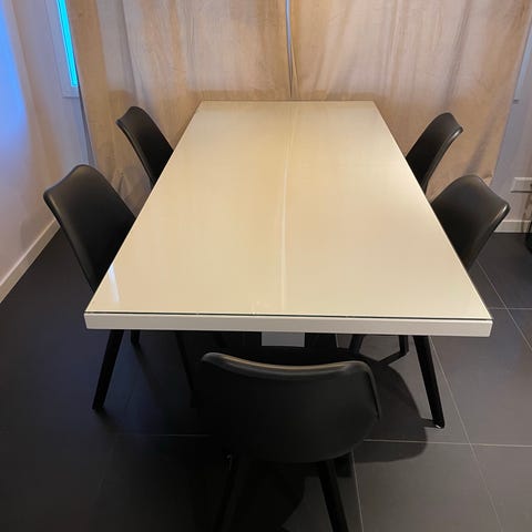 Säljer ett stilrent och stabilt matbord med vit bordsskiva och mörka ben, inklusive 6 svarta stolar. Bordet rymmer bekvämt 6 personer och passar perfekt i både kök och matsal.