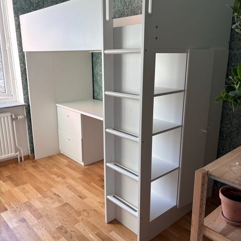 IKEA SMÅSTAD loftsäng med skrivbord och förvaring i vit. Loftsäng Ikea Småstad. Säng, garderob, skrivbord och hylla. Mått: Bredd ca 104 cm, Längd ca 210 cm, Skrivbordsyta 148 cm samt Höjd 182 cm. Gott använt skick. Säljes utan madrass. Säljs delvis nedmonterad. Hämtas på plats, skickas ej. Finns i Samuelsdal i Falun. Ta med bärhjälp. Under sängen finns ett långt skrivbord samt en förvaringsdel med hyllor och lådor. En hög sidomodul med öppna hyllor ger extra förvaring för böcker, leksaker eller kläder. Konstruktionen är i träbaserat material med slät, ljus yta. Passar i sovrum eller barnrum där man vill kombinera säng, arbetsplats och förvaring på en kompakt yta.
