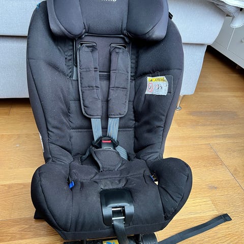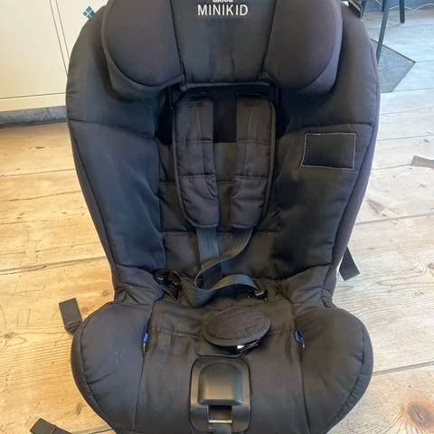 Axkid bilbarnstol för barn upp till 25 kg. Bakåtvänd bilbarnstol med fempunktsbälte och justerbart nackstöd. Stolen monteras med stödben och förankringsband. Klädsel i blått tyg. Använd av ett barn i en bil. Obs, sidoskydd saknas men går att köpa online.