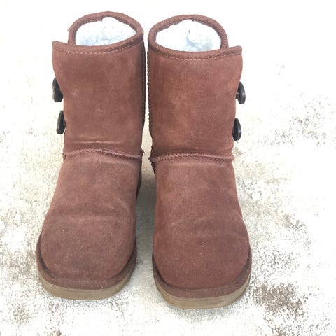 Uggs kopia i storlek 40. Kort modell i brun mocka med mjukt, ljust pälsfoder på insidan. Yttersula i gummi med mönster för bättre grepp. Skorna har dekorativ rem med spänne på sidan. Passar som varma vinterskor i vardagen.