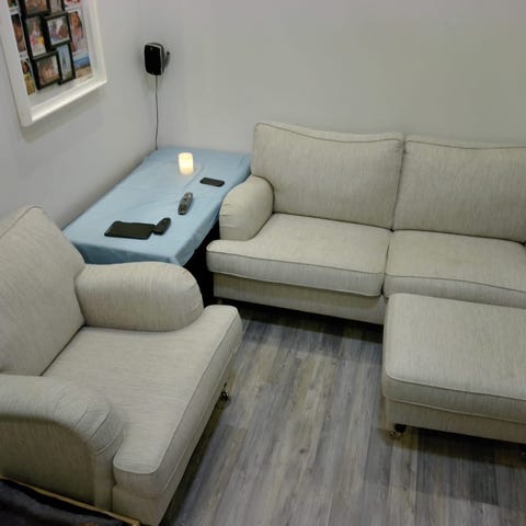Soffa , fåtölj och fotpall. Tvättbara överdrag, snyggare än på bilderna pga bråttomfoto.