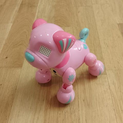 Zoomer Pony interaktiv leksakshäst i rosa och vitt. Elektronisk ponny som reagerar på beröring och rörelse enligt instruktionerna på medföljande lathund. Hästen har rörliga ben och ögon som visar olika uttryck. Tillbehör som syns på bilderna ingår, bland annat leksaksmat och små plasttillbehör. Lämplig som interaktiv leksak för barn som gillar hästar och elektroniska djur.
