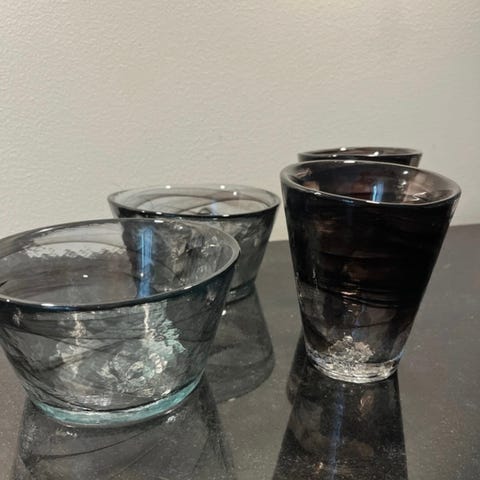 Säljer ett set om 4 vackra dricksglas med dekor i rosa/vitt. Ser ut som handgjort/munblåst glas med levande mönster – passar lika bra till vardag som till dukning.