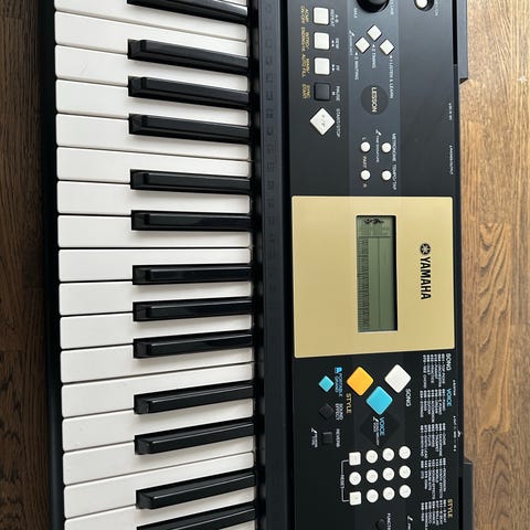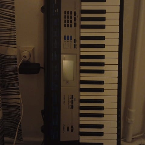 Casio keyboard med pianotangenter och inbyggda funktionsknappar. Passar för övning och enklare musikspel hemma eller i replokal. Drivs via ström eller batteri beroende på modell. Tangentbordet har flera kontrollknappar för ljud och inställningar på ovansidan.