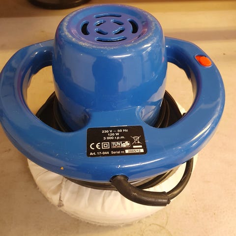 Polermaskin med 120W motor och 180 mm poleryta. Maskinen har dubbla handtag, vibrationsdämpande mjukt grepp och ABS-broms. Obelastad hastighet är 3100 v/min. Låg vikt på 1,8 kg. Levereras med kardborrefäste, polerhätta i fårull och polersvampar.