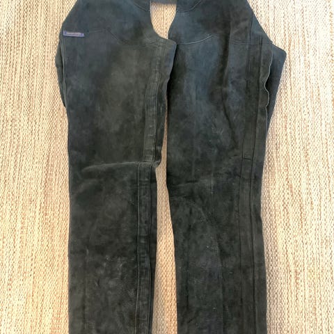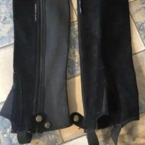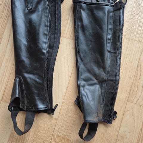 Svarta chaps i äkta läder. Modellen är halvlånga med dragkedja och knappstängning upptill samt rem nedtill. Passar som skydd över skor eller stövlar vid ridning eller annan aktivitet där extra benskydd önskas.