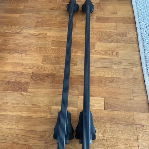 Thule takräcke i aluminium med tillhörande fötter och täckkåpor. Passar till golf utan rails