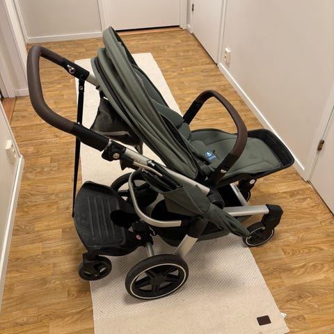 Joolz hub + barnvagn i grå färg. Vagnen har sittdel med justerbart ryggstöd och fempunktssele. Chassit har fyra hjul och varukorg undertill. Handtaget och bygeln är klädda i material med läderlook. Till vagnen hör även en liggdel i matchande grå färg med sufflett och överdrag. Mycket smidig vagn som är enkel att fälla ihop!